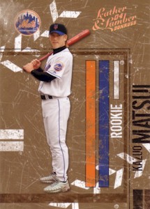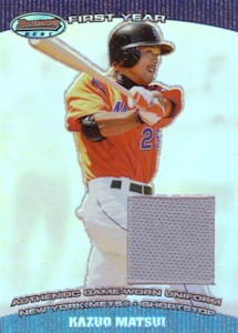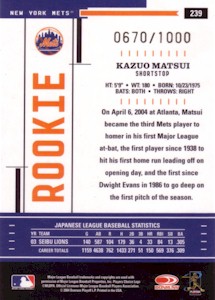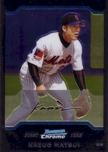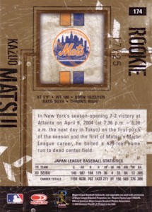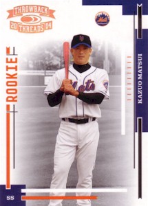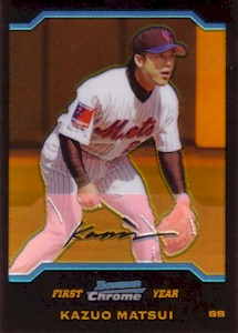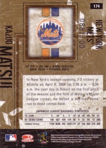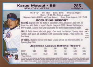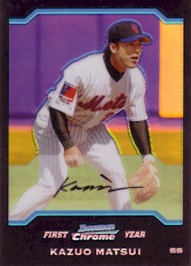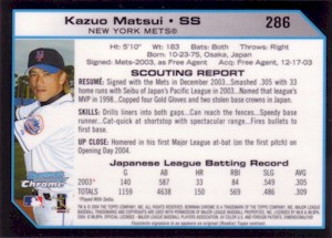 Bowman社から発行されたChromeシリーズで、上から#286、#286 Refractor、#286 Gold Refractor50枚限定、#286 Xfractor(172枚限定・工場で直接アクリルケースに入れられ、Topps Uncirculatedのホログラムで封印されている)の3種類。よく注意しないと#286と#286 Refractorが同じものに見えてしまうことがあります!。このシリーズはこの他に290枚限定ブルー版(Topps Uncirculated)も存在します。 <2004 Bowman Chrome First Year #286> Scouting Report. Resume: Signed with the Mets in December 2003...Smashed .305 with 33 home runs with Seibu of Japan's Pacific League in 2003...Named that league's MVP in 1998...Copped four Gold Gloves and two stolen base crowns in Japan. Skills: Drills liners into both gaps...Can reach the fences...Speedy case runner...Cat-quick at shortstop with spectacular range...Fires bullets to first base. Up Close: Homered in his first Major League at-bat(on the first pitch) on Opening Day 2004. |