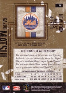 Donruss社からLeather & Lumberシリーズで25枚限定パッチカード。 <2004 Donruss Leather & Lumber #174> The enclosed piece of bat was cut from an Authentic Jersey personally used by Kazuo Matsui in an official Major League Baseball game. The authentic Game-Worn Jersey was obtained and is guaranteed by Donruss Playoff L.P. |